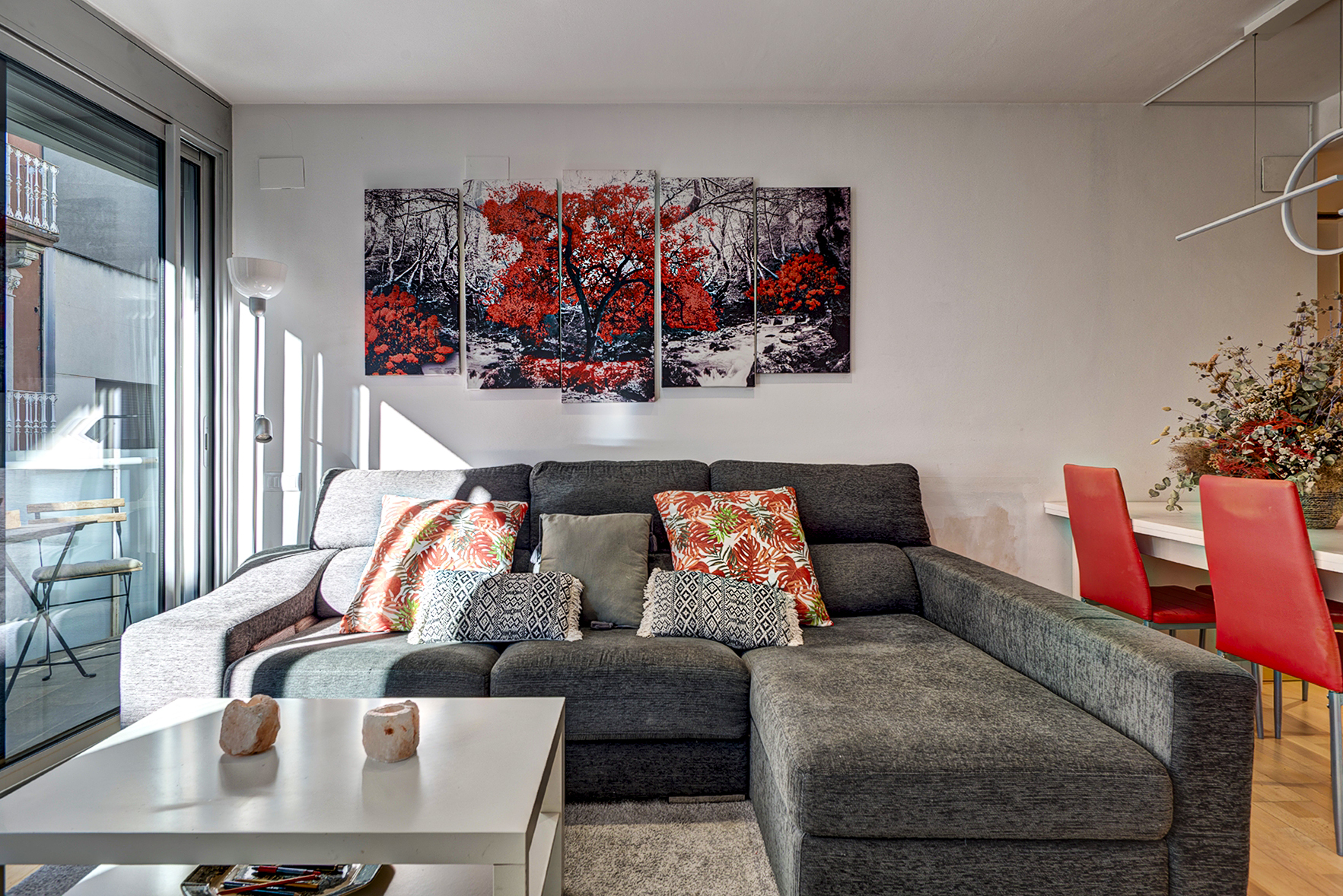 Sala d’estar menjador àmplia i lluminosa, amb sortida a un balcó, perfecta per esmorzar al sol o relaxar-te al capvespre.